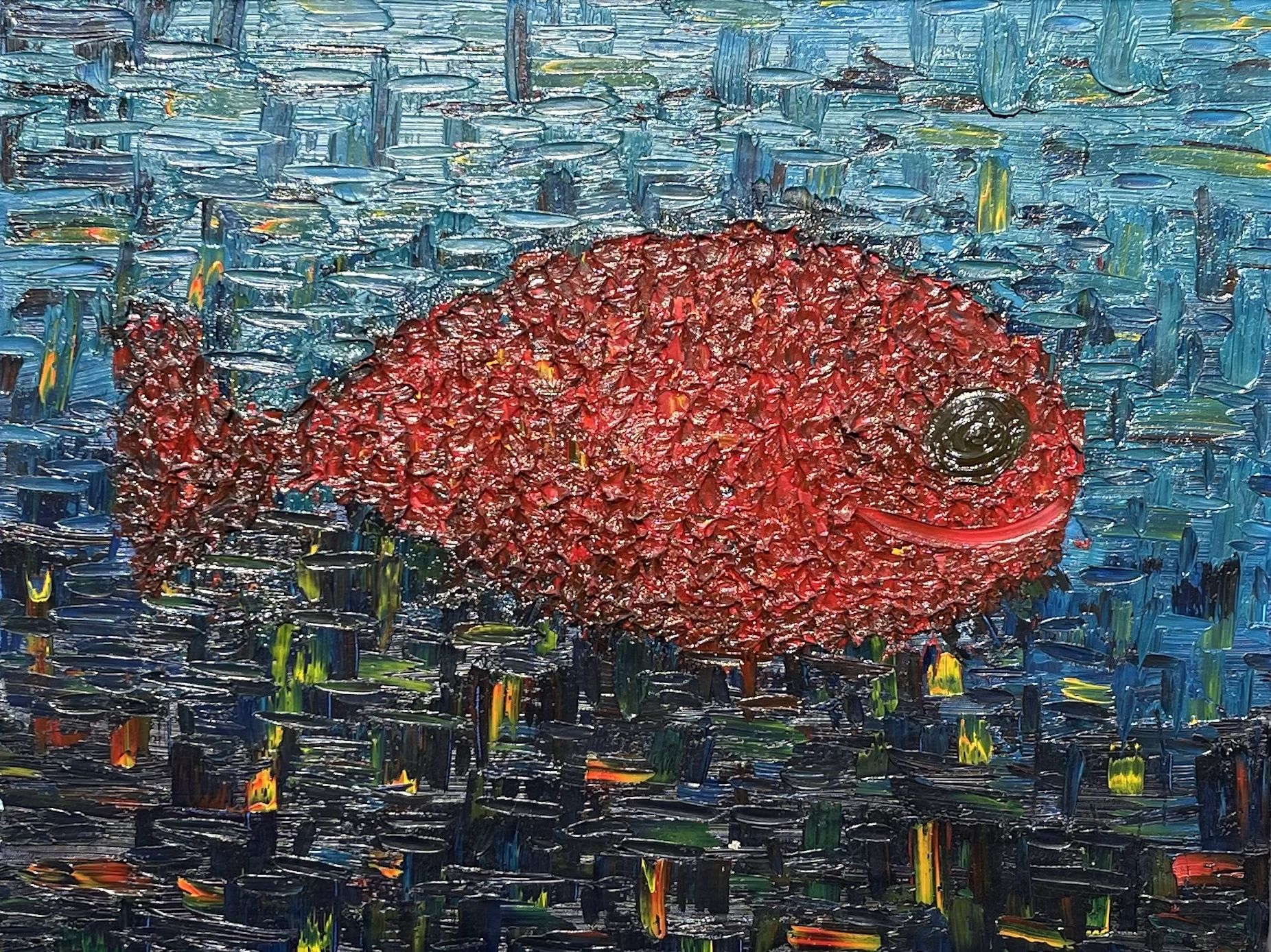 Blue and Red Fish Oil Painting 28x22x1.25, inspired by snorkeling off of the coast of Bali with my little boy.